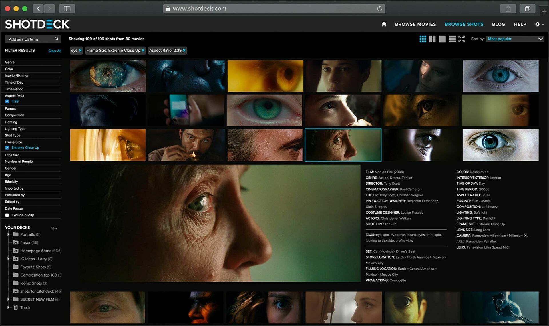 Para quem ainda não conhece, ShotDeck é um site dedicado a uma ampla gama de referências visuais, onde oferece um extenso banco de dados de filmes indexados, juntamente com informações técnicas e estéticas sobre cada produção, como a câmera utilizada, o tipo de lente, iluminação, o enquadramento e muito mais.